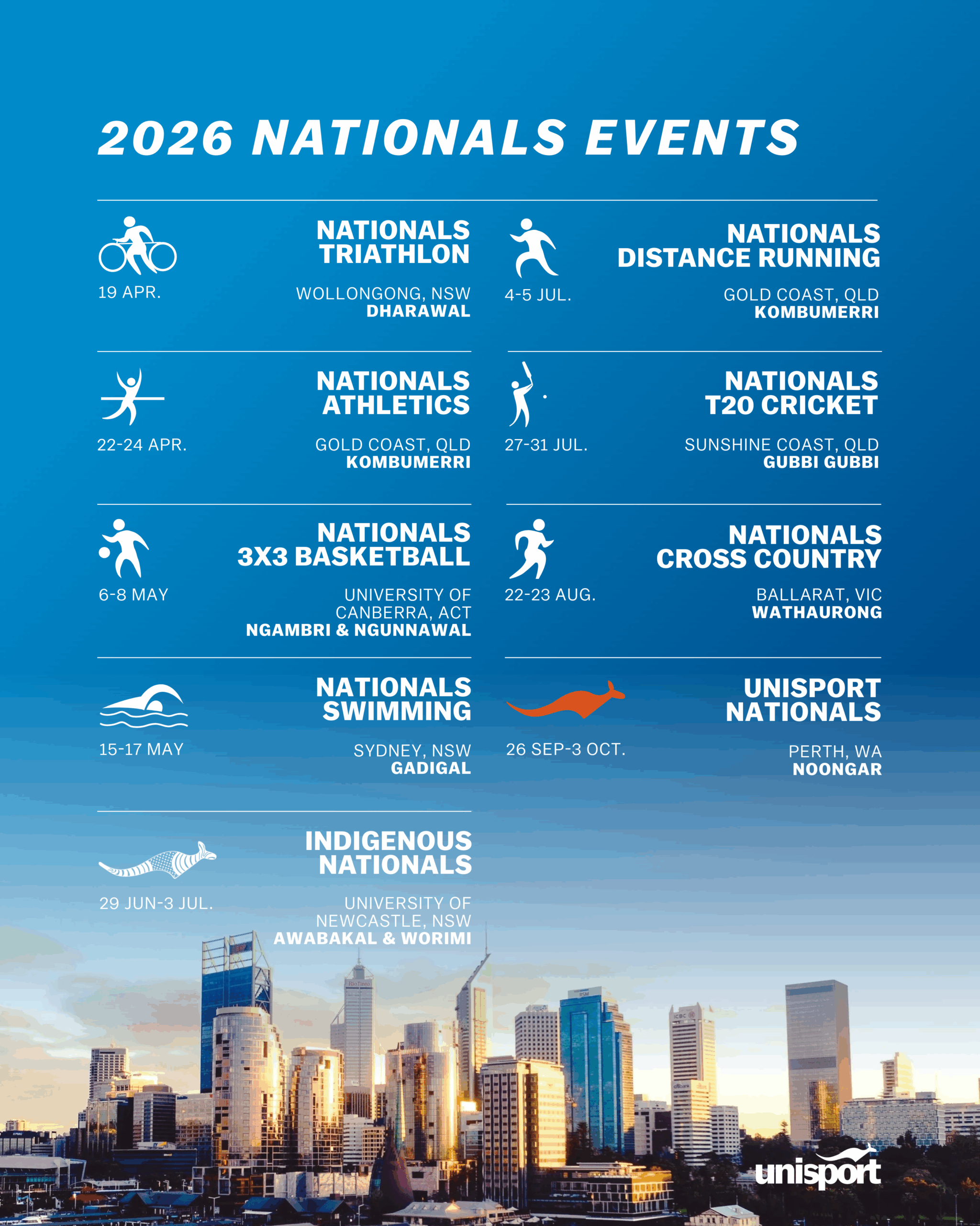 Australian Universities to compete head to head in a number of national standard sporting competitions to be crowned UniSport Nationals Champions