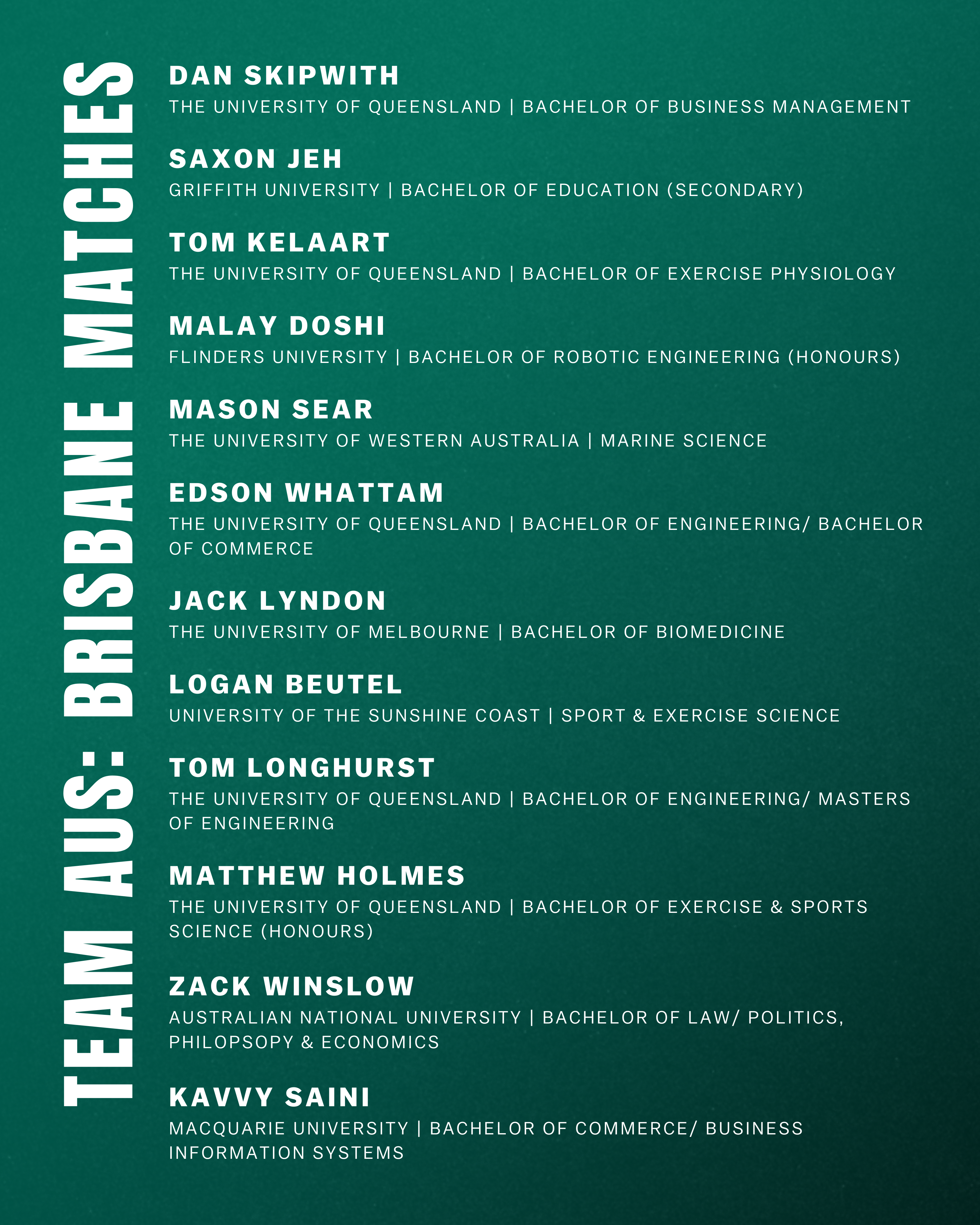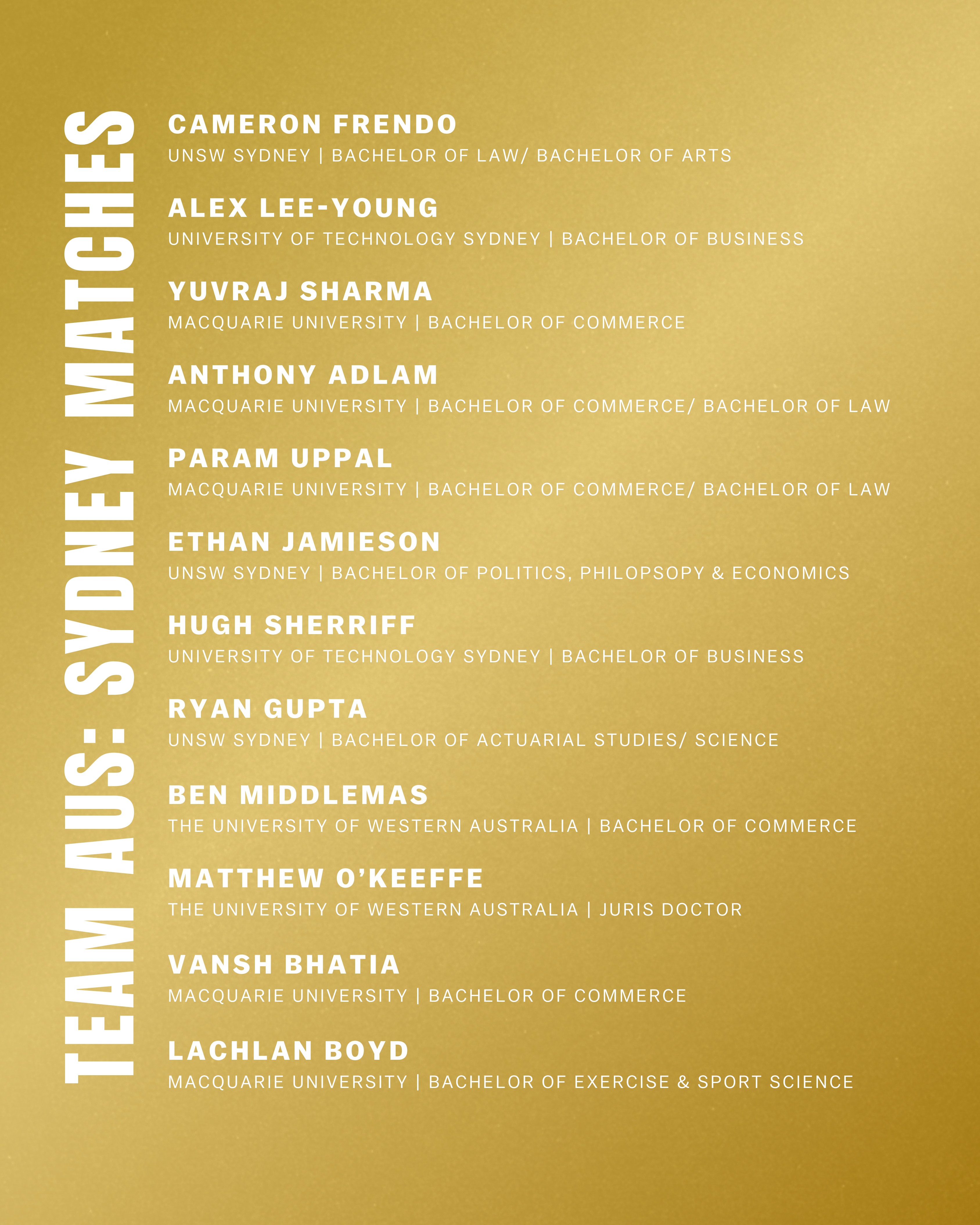 A squad of 24 Australian student-athletes representing 10 different universities from across Australia has been selected to play in six matches against the Indian Universities Team in December 2025. The first 3 matches will be played in Brisbane on Wednesday 10 December, Thursday 11 December and Friday 12 December. The second half of the tour will see 3 matches played in Sydney on Tuesday 16 December, Wednesday 17 December and Thursday 18 December.